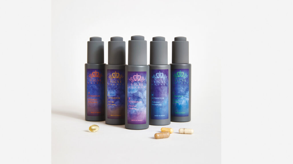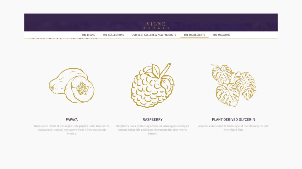 Création de l’identité visuelle de la marque beauté luxe Vigne Royale. Design du logo, création de la charte graphique et des illustrations.